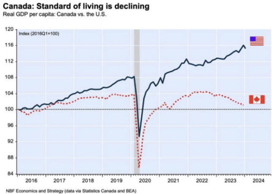 Last, the chart below shows that Canada’s productivity is lagging that of the US (Source: National Bank Financial). This is important because economic productivity enables us to financially protect what is ours. Our inability to grow our productivity puts us further behind and less able to pay for the things that matter to us collectively such as public health care, education and welfare. In short, because of these productivity gaps, our American neighbors have more resources available to pay for things, regardless of our political or ideological differences.