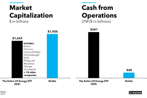 The first theme is the difference in valuation between mega-cap and all other businesses. Consider, for instance, the valuation of NVIDIA, a leading producer of chips for Artificial Intelligence applications. With a market capitalization (i.e. what it costs to buy the company) nearing $2 trillion and annual cash generation of $19 billion, NVIDIA yields less than 1%. On the other hand, investing in the 23 largest US energy companies, with a combined market cap of $1.645 trillion, yields close to $241 billion or 15% annually.